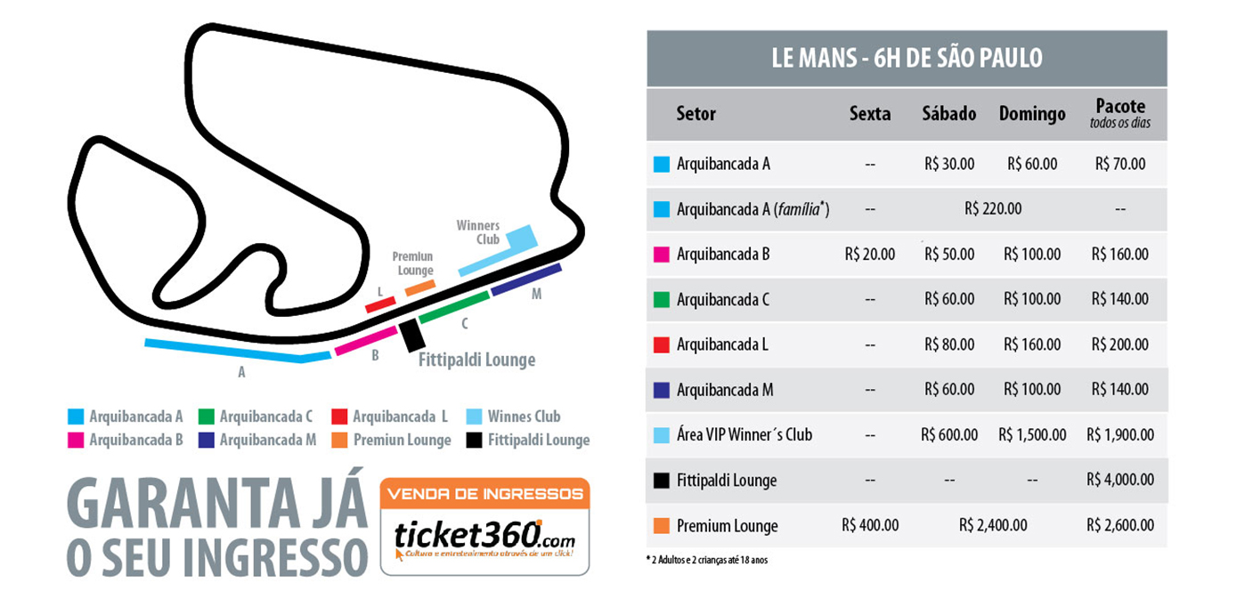Com opções de pacotes para toda a família, os ingressos para o Le Mans 6 Horas de São Paulo custam de R$ 30 a R$ 4.000 e já podem ser adquiridos no site oficial do evento (6hsp.com). Confira abaixo a tabela de preços e a divisão das arquibancadas: