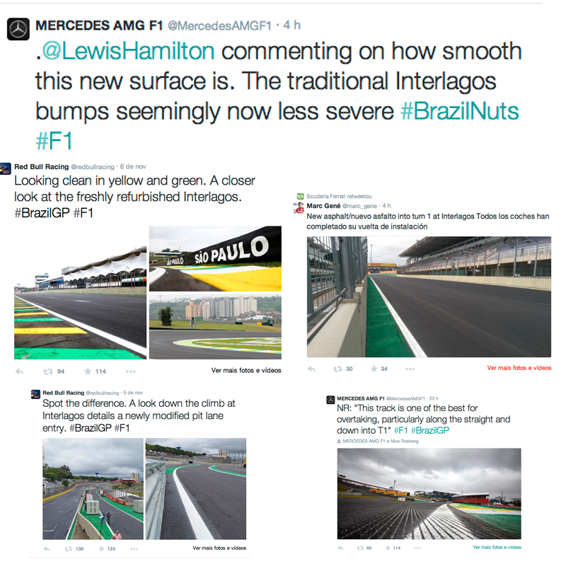 A Lotus, que tem como pilotos Pastor Maldonado e Romain Grosjean, classificou como “impressionante” o novo asfalto da pista ontem em sua conta do Twitter, ao passo que a Red Bull Racing, escuderia defendida por Sebastian Vettel e Daniel Ricciardo, comentou, também na rede de microblogs, a beleza da decoração verde e amarela especialmente preparada para o GP do Brasil.