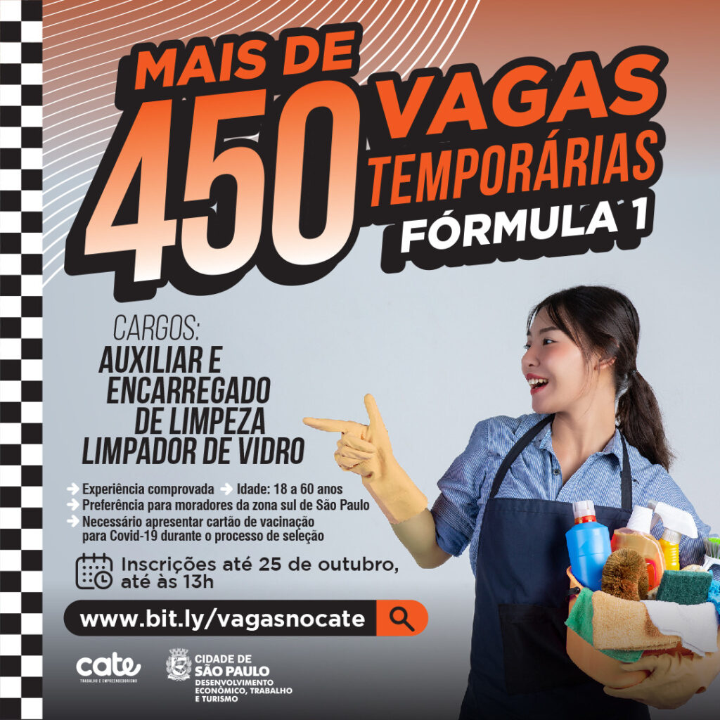 As inscrições para atuar em áreas operacionais do GP de Fórmula 1 estão abertas até o dia 25 de outubro. A iniciativa surgiu da Secretaria Municipal de Desenvolvimento Econômico, Trabalho e Turismo, que abriu seleção para 450 novas vagas temporárias para atuação no evento, que acontece entre os dias 12 e 14 de novembro, no Autódromo de Interlagos. Com este processo seletivo, a Prefeitura de São Paulo intermedia 600 oportunidades de trabalho temporário.