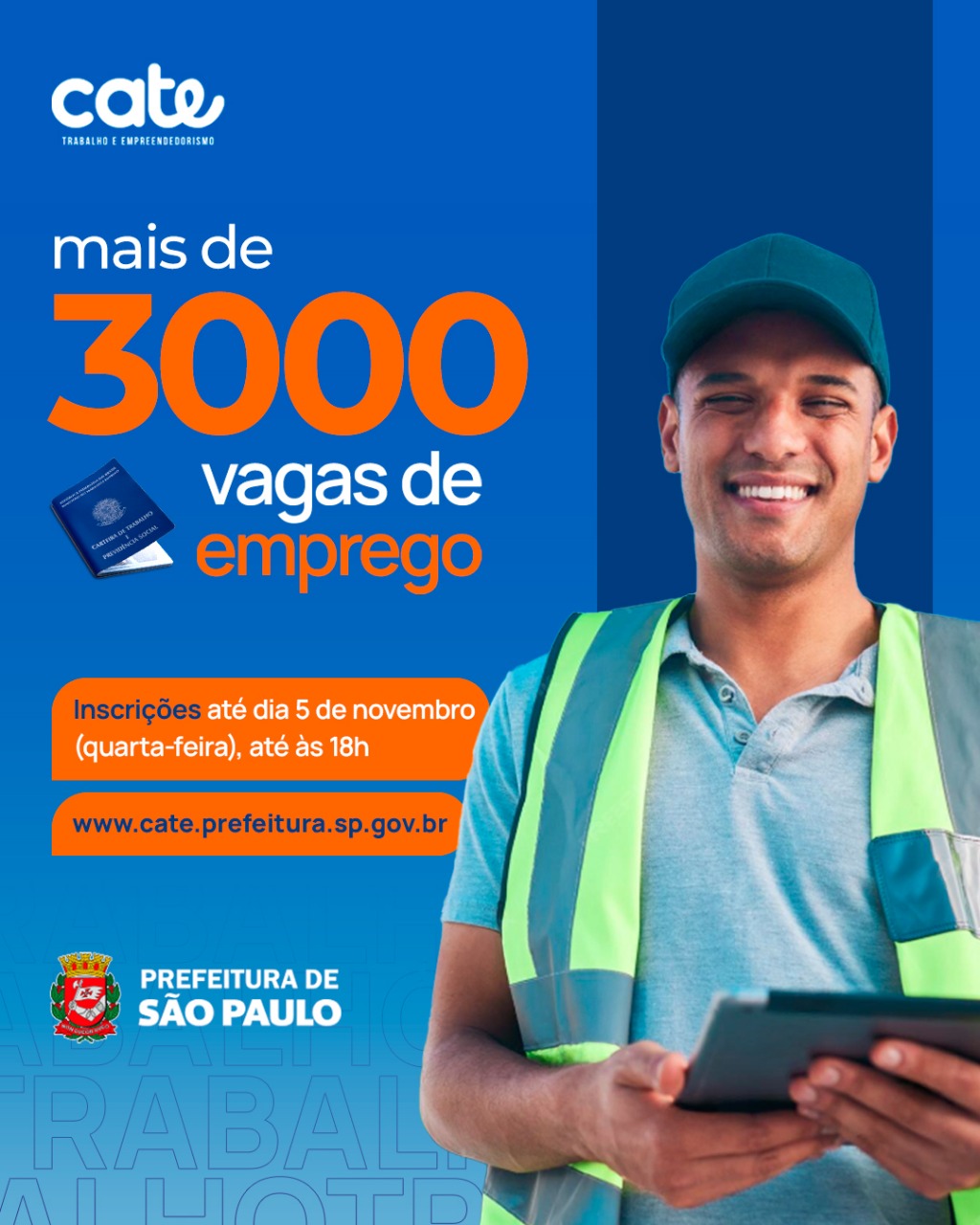 A Prefeitura de São Paulo realiza no dia 4 de novembro, o mutirão de emprego para pessoas em vulnerabilidade social, no Cate Central. As inscrições também podem ser feitas pela plataforma on-line do serviço, até o dia 3 de novembro. A atividade ocorre em parceria com a Secretaria Municipal de Assistência e Desenvolvimento Social. No dia estão previstas atividades paralelas de orientação sobre documentação, corte de cabelo, manicure, varal solidário, entre outros.