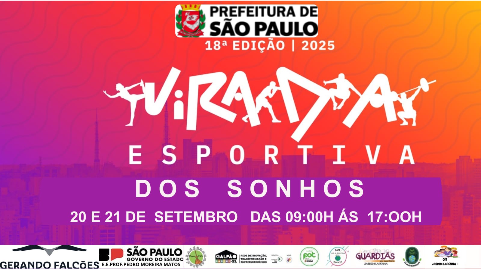 A Prefeitura de São Paulo, por meio da Secretaria Municipal de Esportes e Lazer (SEME), realiza, nos dias 20 e 21 de setembro de 2025, a 18ª edição da Virada Esportiva — um dos maiores eventos de esporte e lazer do país. Com uma programação totalmente gratuita, a iniciativa tem como objetivo incentivar a prática de atividades físicas, combater o sedentarismo e promover a ocupação dos espaços públicos pela população.