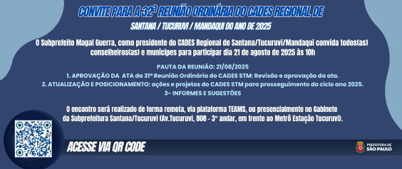 A Subprefeitura de Santana/Tucuruvi informa que no próximo dia 21 de agosto de 2025, às 10h, será realizada a 32ª Reunião Ordinária do Conselho Regional de Meio Ambiente, Desenvolvimento Sustentável e Cultura de Paz (CADES) de Santana/Tucuruvi/Mandaqui. O encontro será conduzido pelos membros do Conselho e tem como objetivo debater pautas importantes relacionadas ao meio ambiente, ao desenvolvimento sustentável e à qualidade de vida da população da região.