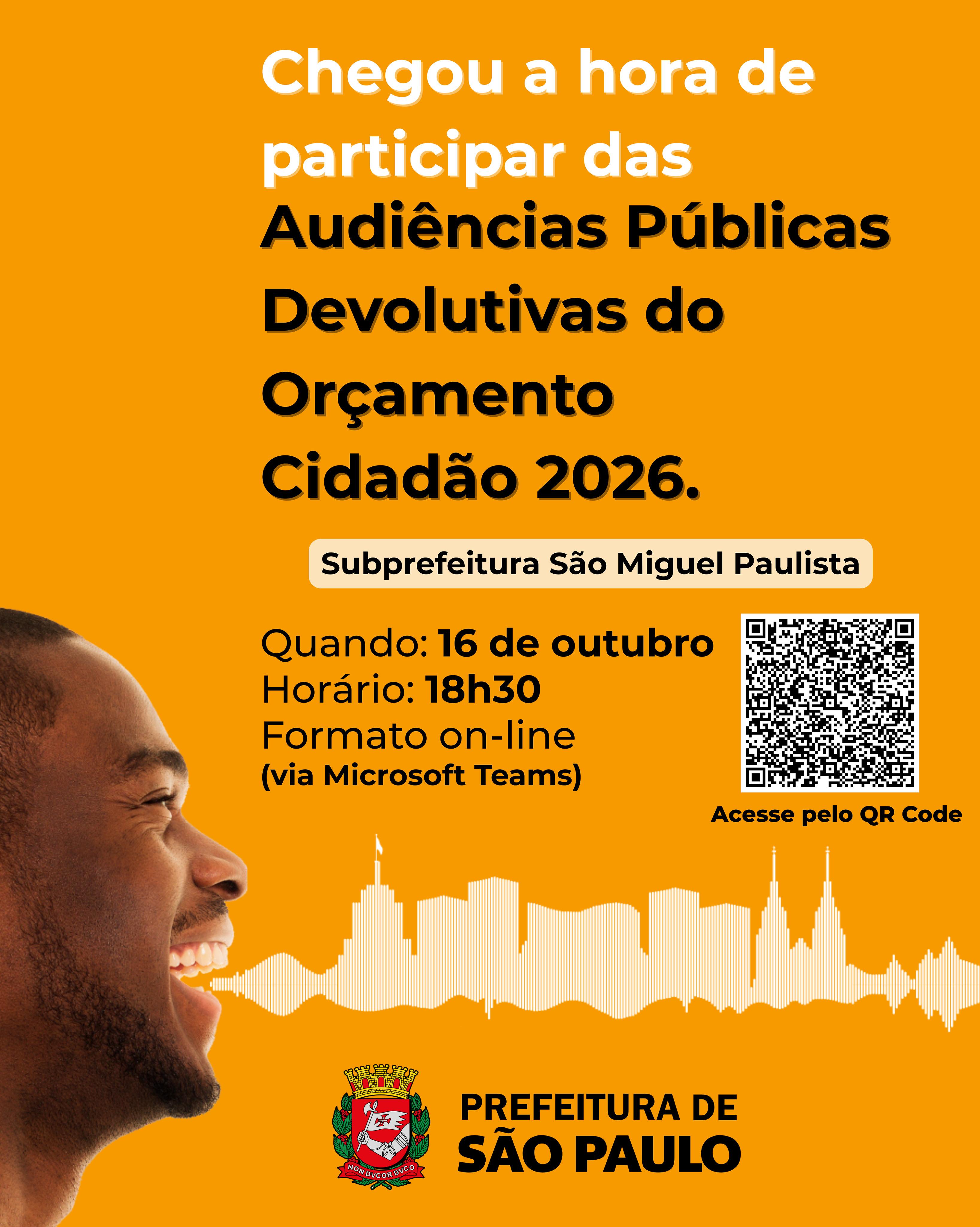 Na Subprefeitura de São Miguel Paulista, a audiência pública acontece no dia 16 de outubro (quinta-feira), às 18h30. Na ocasião, serão apresentadas as análises de viabilidade das sugestões enviadas pelos moradores da região, promovendo transparência e fortalecendo a participação popular nas decisões da cidade.