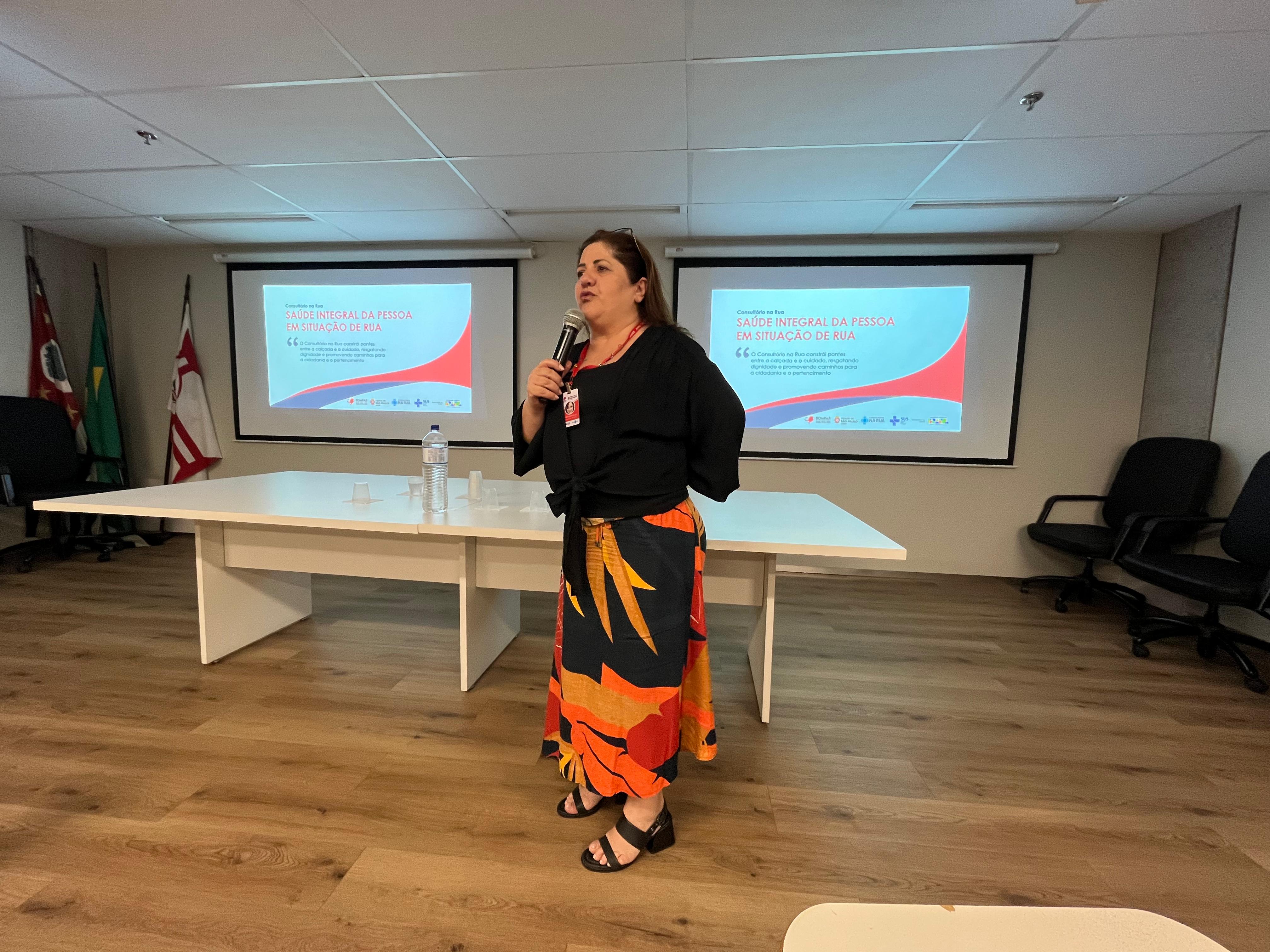 O evento seguiu com a apresentação da Coordenadora do Consultório na Rua do Centro Social Nossa Senhora do Bom Parto (BOMPAR), Marta Regina Marques, sobre a atuação das equipes de agentes nas Cenas Abertas de Uso de São Paulo. “Quando se fala em cuidado com pessoas em situação de rua, é importante que a gente pense em uma rede ampla, que envolve saúde, assistência social, trabalho, educação e justiça e é com isso que estamos tendo cada vez mais sucesso na adesão das pessoas nas saidas qualificadas das ruas.”, ressaltou Marta Regina.