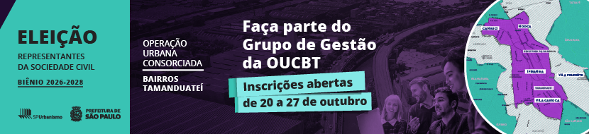 A Prefeitura de São Paulo, por meio da São Paulo Urbanismo e da Secretaria Municipal de Urbanismo e Licenciamento (SMUL), abre, nesta segunda-feira (20), as inscrições para representantes da sociedade civil no Grupo de Gestão da Operação Urbana Consorciada Bairros do Tamanduateí (OUCBT) para o biênio 2026–2028. Estão em disputa seis vagas destinadas a entidades acadêmicas ou de pesquisa, empresariais, organizações não governamentais (ONGs) e representantes de moradores e trabalhadores da região. As inscrições devem ser feitas exclusivamente através do e-mail oucbt@spurbanismo.sp.gov.br até o dia 27 de outubro, conforme as regras dos editais disponíveis nesta página.