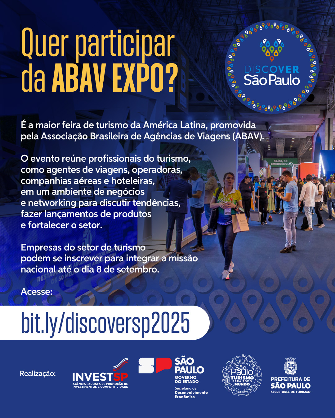 O Governo do Estado e a Prefeitura de São Paulo levarão uma comitiva com até 10 empresas de turismo da capital paulista para a ABAV Expo, no Rio de Janeiro, um dos principais eventos do setor no país e que irá reunir mais de 2 mil marcas expositoras. A expectativa é de que 42 mil visitantes passem pelo RioCentro nos três dias de evento, além de dezenas de promotores de eventos e representantes de operadoras de viagens, agências de turismo, hotéis, restaurantes, companhias aéreas e empresas de cruzeiros.